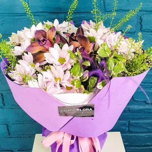 Лучезарность – букет с ирисами, альстромериями и хризантемой
