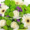 Нежную композицию, составленную из светлых роз и гербер, превосходно подчеркивает кустовая зеленая хризантема. Особое очарование и выразительность придает статица. Яркий фиолетовый букет великолепно подойдет для того, чтобы поздравить коллегу с дня рождения или любым другим торжеством.