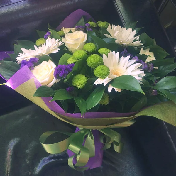 ДЕЛЮКС: роза белая - 15 шт, гербера белая - 9 шт, хризантема кустовая зеленая - 10 шт, статица - 7 шт, салал, фетр из двух слоев - зеленый и фиолетовый, лента. Примерный размер: 45Х45 см.