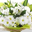 Уменьшенный: хризантема кустовая ромашковая - 3 шт, фрезия/альстромерия белая - 1 шт, альстромерия белая - 3 шт, салал, фетр зеленый, натуральная упаковка.