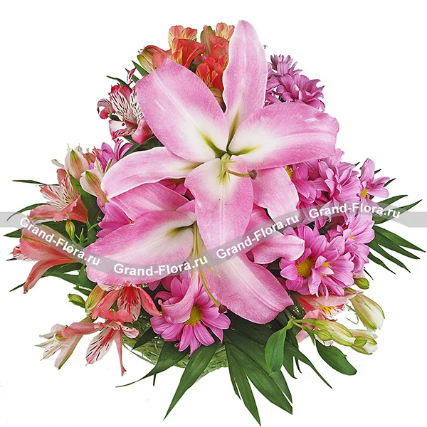 (на фото): лилия розовая (возможна замена на белую)- 1 шт., хризантема кустовая фиолетовая - 3 шт., альстромерия розовая - 1 шт., альстромерия оранжевая - 4 шт., салал, упаковка натуральная зеленая, золотой бант. Примерный диаметр букета 30х30 см.