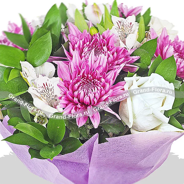 Очаровательный букет, собранный из белых роз и альстромерий, одноголовых фиолетовых хризантем, удачно оформлен с помощью фетровой обертки в тон цветам.