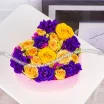 Стандартный: роза желтая - 2 шт., роза кустовая желтая - 3 шт., эустома синяя - 6 шт., статица фиолетовая, статица желтая., оазис., фетр. Примерный размер 25Х25 см.